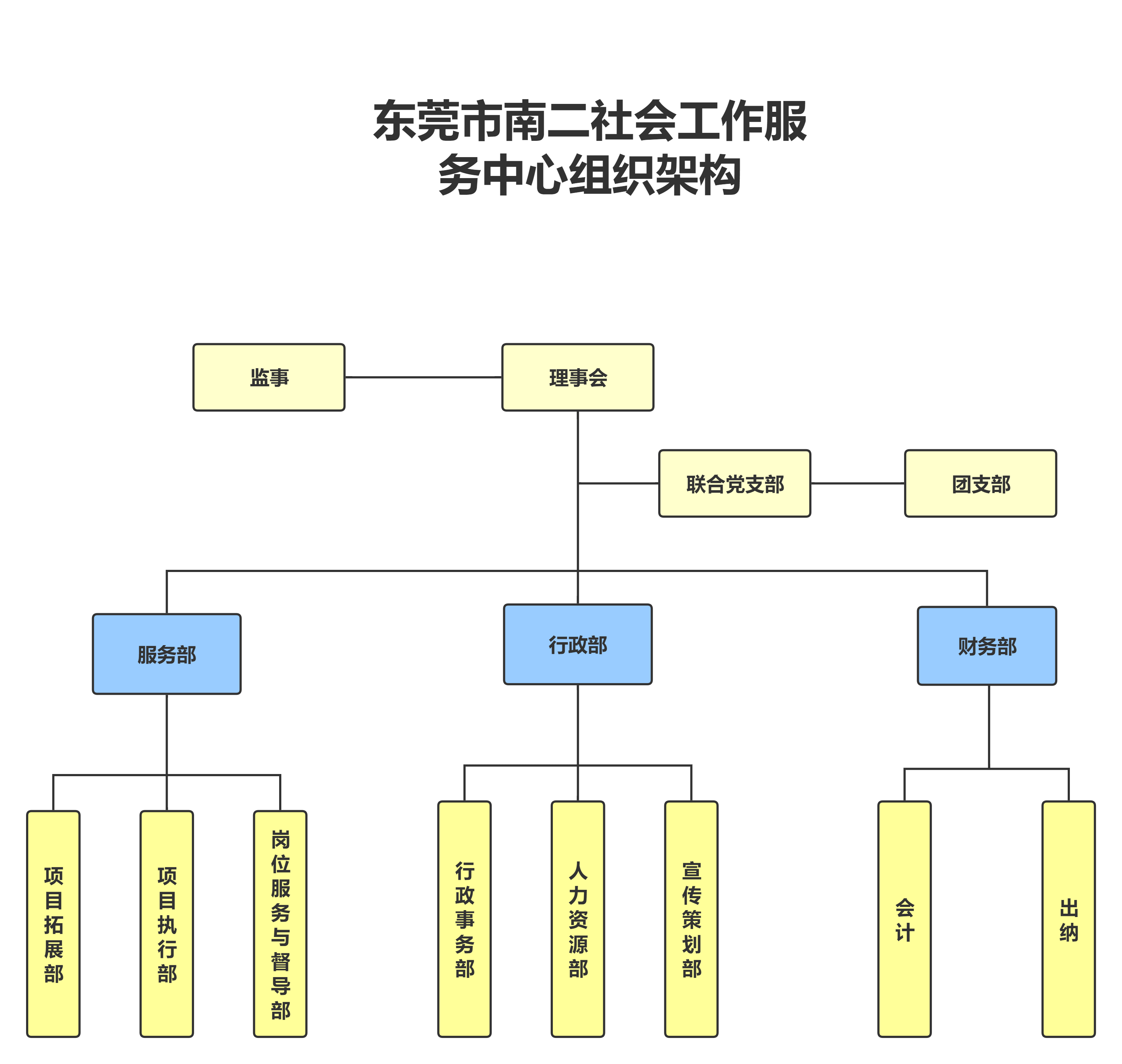 人力资源部:负责人员招聘、培训、绩效考核、薪酬福利及劳动关系管理,搭建人才发展体系,吸引和培养专业社工人才。