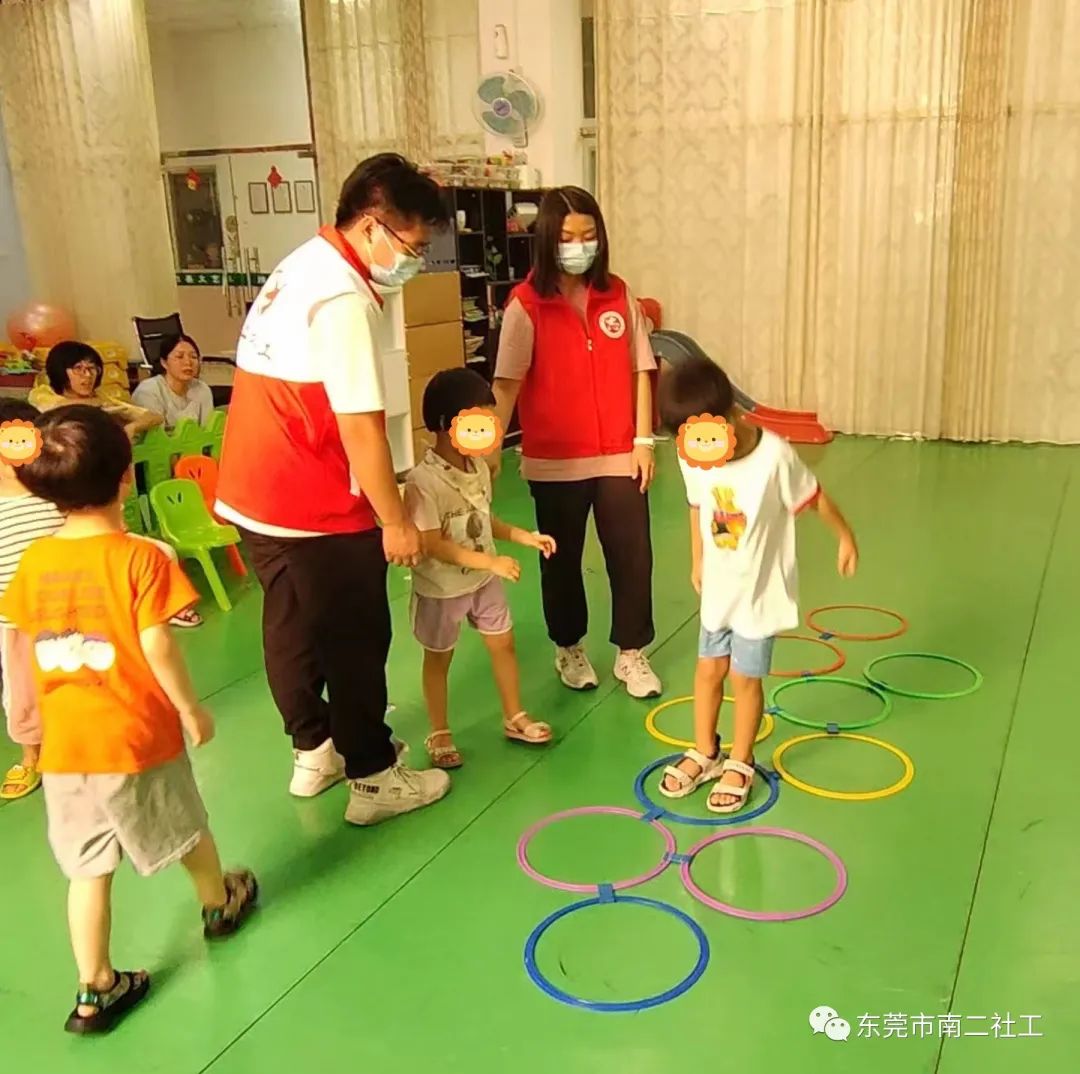 活动内容是通过彩虹隧道、过平衡木、跨栏、跳圈圈游戏,可以提高全身协调性,能使一些平时使用较少的肌肉得到锻炼,同时也能强化全身的肌肉、韧带、骨骼等组织部位。有趣的游戏吸引儿童们的参与,民生大莞家社工与孩子们进行“一对一”互动,带领儿童们参与游戏,渐渐拉近了与他们的距离,有了简单言语交流。