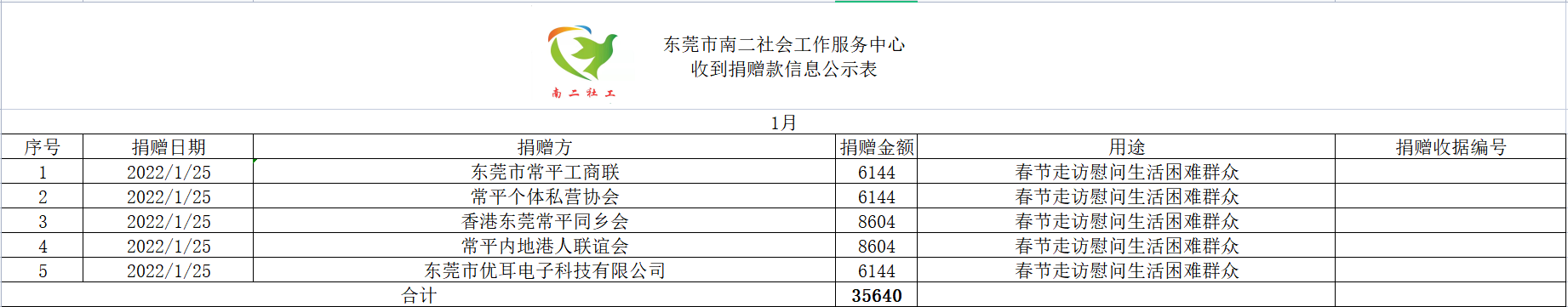 东莞市常平工商联(商会)、东莞市常平个体私营协会、香港东莞常平同乡会、常平内地港人联谊会、东莞市优耳电子科技有限公司捐赠:麦片180包,饼干180包,蛋卷90罐,花生油90罐,牛奶90箱,大米90包共计金额:35640元