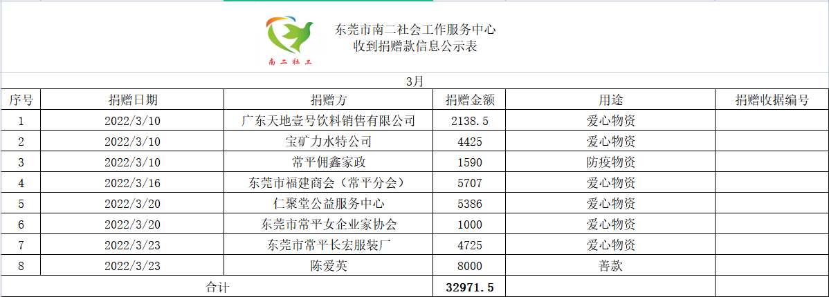 天地一号公司、宝矿力水特公司、常平佣鑫家政、东莞市福建商会(常平分会)、仁聚堂公益服务中心、东莞市常平女企业家协会、东莞市常平长宏服装厂、陈爱英捐赠:天地一号、宝矿力、护目镜、需求食物等爱心物资、 善款共计金额:32971.5元