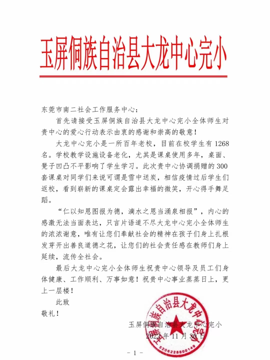 广东爱汀堡嘉年华酒业有限公司捐款用于购买课桌椅帮助玉屏侗族自治区大龙中心完小教习设备更换。