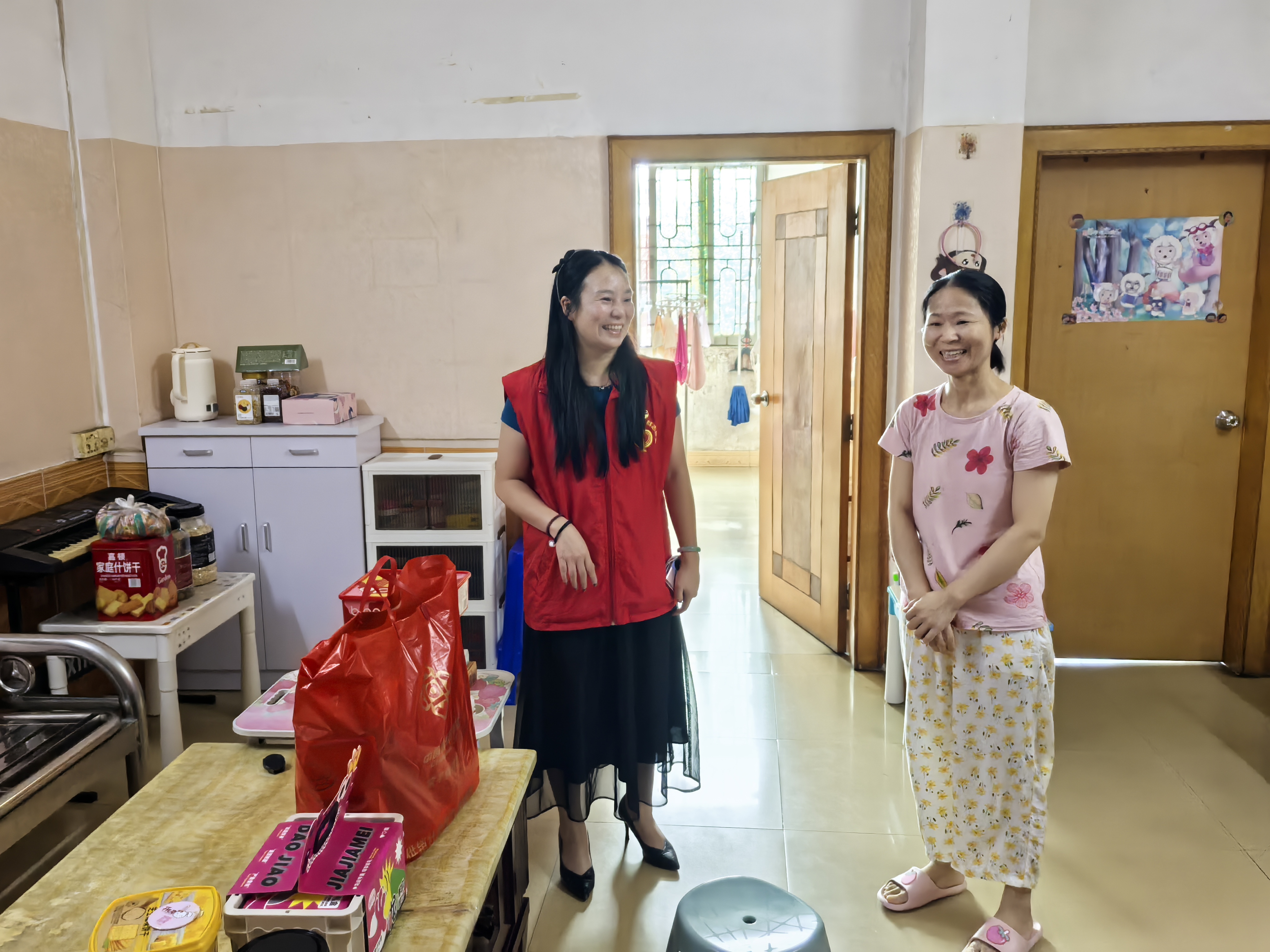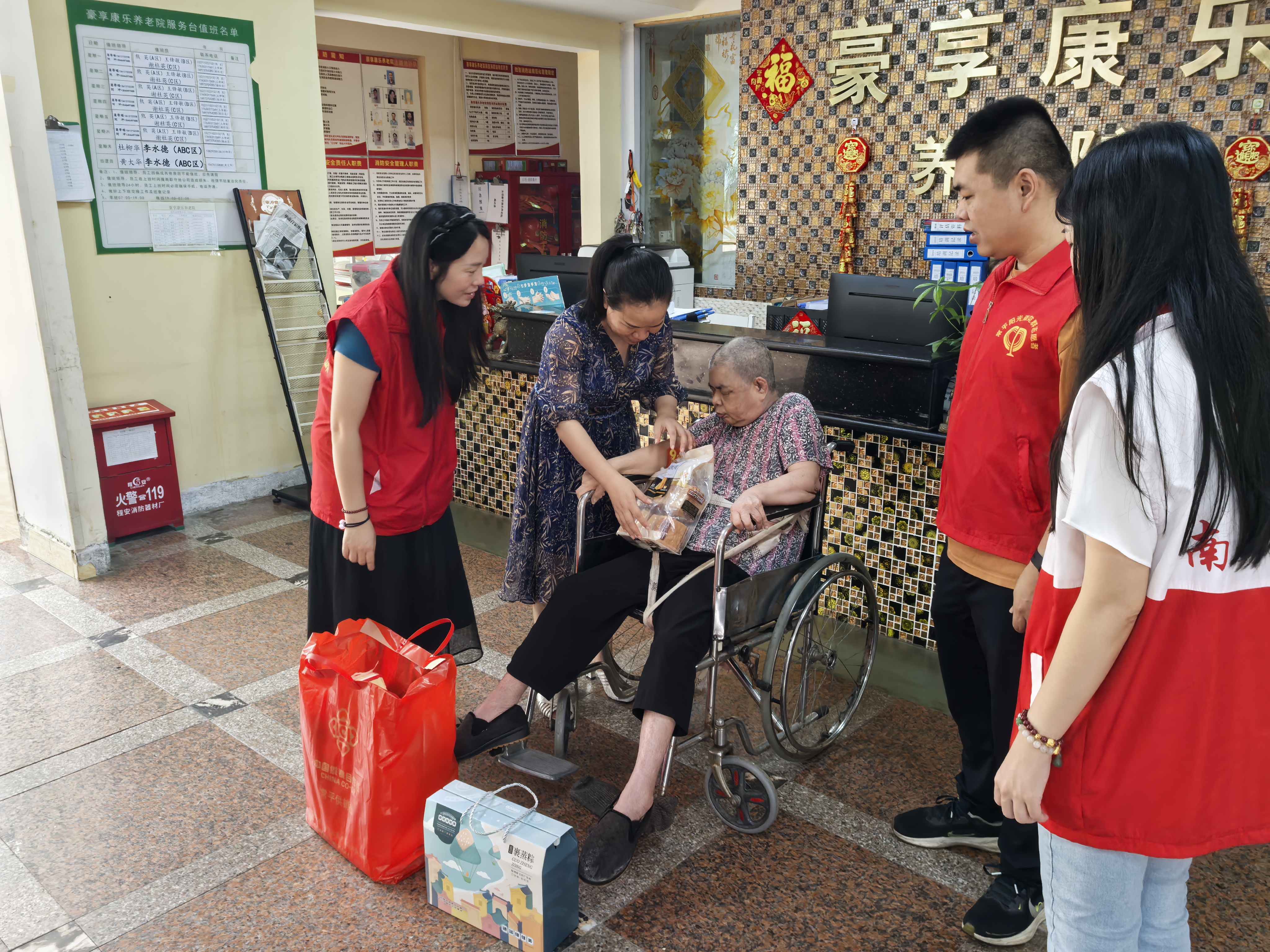 粽叶飘香迎端午,童心飞扬庆六一。为弘扬中华民族尊老爱幼的传统美德,深化党建引领下的关怀服务,5月28日上午,南二社会工作服务中心联合常平镇"两新"第二联合党支部,开展"庆端午,迎六一"走访慰问活动,为对口帮扶家庭及养老院老人送上节日祝福。上午9时,慰问组首先来到"共享亲人"结对帮扶对象邓女士家中。社工与党员志愿者将满载心意的慰问品送到邓女士手中,详细了解其家庭近况。工作人员重点询问了孩子近期的情况,鼓励其保持积极乐观的心态,努力学习。邓女士对党组织的长期关怀表达感谢,表示将积极面对生活困难,为孩子创造更好的成长环境。随后,慰问组前往常平豪享康乐养老院探望高龄的杨婆婆。社工于党员志愿者为老人送上端午粽、营养品等慰问物资,并细致询问其身体健康状况与生活起居需求。粽香萦绕中,这份跨越代际的温暖对话,让节日关怀愈发鲜活生动。