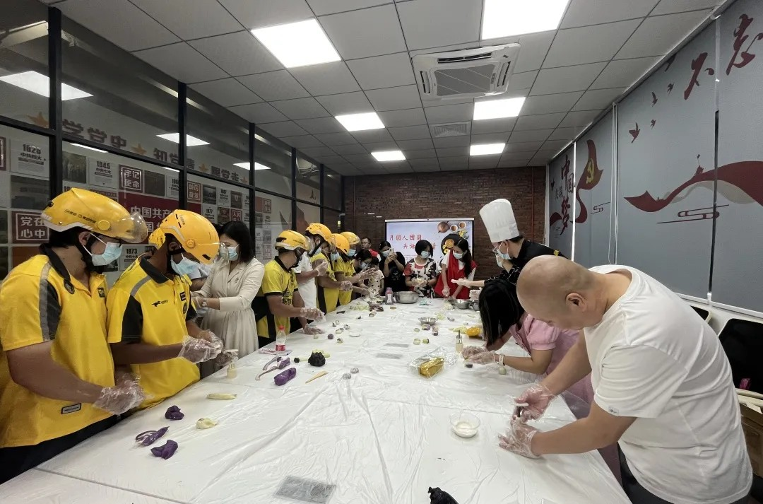 接下来,本次活动还邀请糕点师傅指导大家做冰皮月饼,在专业糕点师傅的指导下,新就业群体和党员志愿者纷纷动手,体验冰皮月饼制作,从材料准备-制作冰皮-包馅成型-装饰与成型整个过程。
