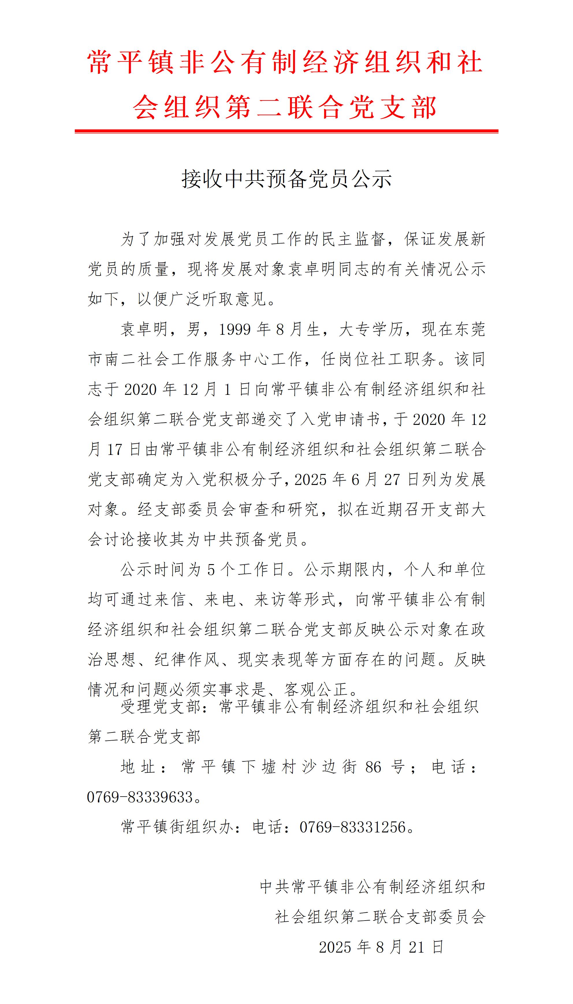 祝贺!南二社工袁卓明同志被常平镇“两新”组织第二联合党支部接收为中共预备党员