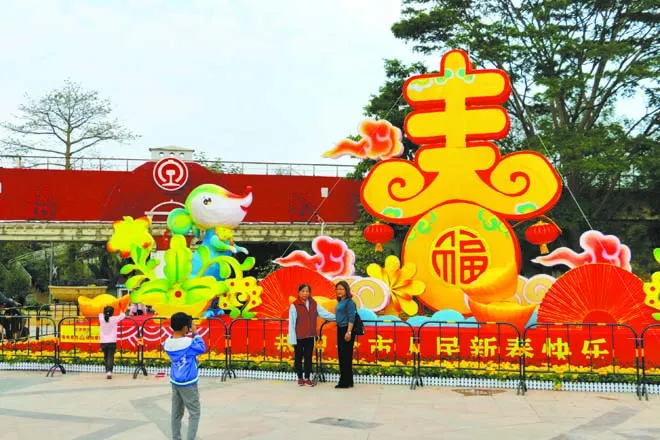 在东莞东站站前广场,一大型春节灯饰和花卉景点吸引不少旅客拍照留念。该灯饰造型以红色和黄色为主,正中间的“春”字、两旁的灯笼元素以及造型下方“喜迎中国年”的字样,营造了浓郁的年味。市民王小姐表示,各式灯饰造型别致,晚上亮灯时更是光彩夺目。